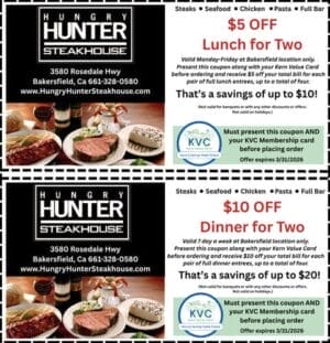 (Must present Hungry Hunter/KVC online coupon with KVC membership card