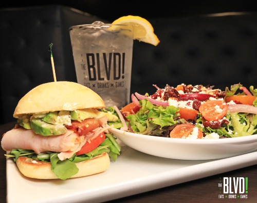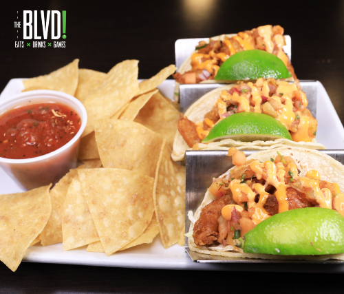 The BLVD has a thoughtfully crafted menu featuring gastro pub style farm to table cuisine. Shared plates include items ranging from nacho stack, bone-in or boneless wings, wild fries and bacon Jalapeño wontons.
